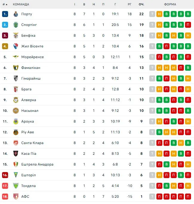 Поточна турнірна таблиця чемпіонату Португалії