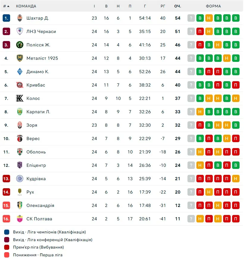 Камбек Динамо, поразка ЛНЗ, падіння Олександрії: турнірна таблиця УПЛ після 24-го туру